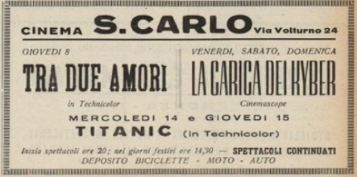 esordisce il Cineteatro San Carlo: le prime proiezioni avvengono all’aperto, negli spazi dell’oratorio. Il film scelto per l’occasione è Primavera al sole (Thorpe, 1948), pellicola ambientata nel mondo del balletto. Dopo una interruzione nei mesi di settembre e ottobre, la sala vera e propria (circa 700 posti) viene inaugurata il
