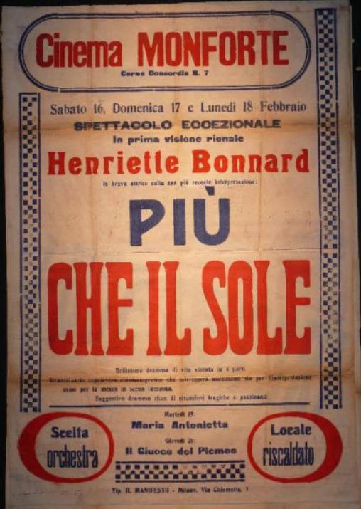 Manifesti tipografici (fonte: Cineteca Italiana www.lombardiabeniculturali.it) 1920 Zena (spettacolo di danza) – il 30 ott. immagine manif. con slogan Grandiosi Debutti/Grandi Novità – nov. immagine 1921 Il signor Gill (spettacolo teatrale) – il 15 gen. immagine Les Brits (spettacolo teatrale) – il 18 e 19 giu. immagine Onofri (spettacolo teatrale) – il 1 apr. immagine Il forzato n. 21 – il 22 nov. immagine 1922 4 Maier